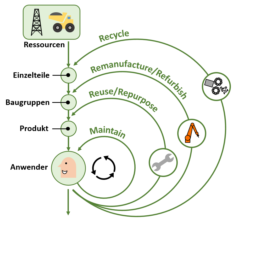 +Ausgehend von dem Systemdiagramm der Kreislaufwirtschaft werden im Rahmen des Projekts unterschiedliche Verwertungsrouten untersucht. In Anlehnung an die Darstellung der verschiedenen biologischen und technischen Kreislaufoptionen in der Kreislaufwirtschaft, wird in diesem Projekt auf die technischen Kreislaufoptionen eingegangen. Hierbei kann ein Produkt je nach Zustand direkt wiederverwendet, instandgesetzt, wiederaufbereitet oder vollständig der stofflichen Wiederverwertung zugeführt werden. Der technologische Lösungsansatz des Projekts besteht dabei in der ganzheitlichen Kreislaufbetrachtung von der automatisierten Demontage bis zum Remanufacturing am Beispiel des Batteriesystems und des Elektromotors.