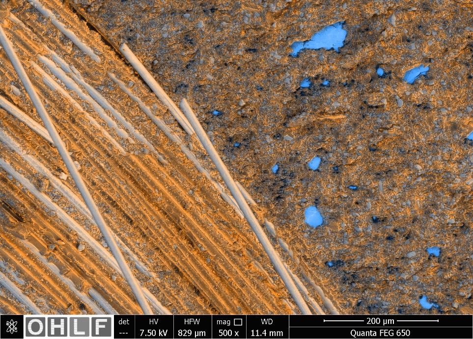 Durch die Detektion unterschiedlicher Signalarten können bei Hybridproben unterschiedlich leitende und nicht-leitende Materialien simultan dargestellt werden. Abbildung drei zeigt die Oberfläche aus einem Klebeversuch. Das Mixbild aus CBS- und LFD-Detektor veranschaulicht bei 500-facher Vergrößerung die Stahloberfläche (blau) mit den Resten der Kunststoffbeschichtung und Glasfasern.