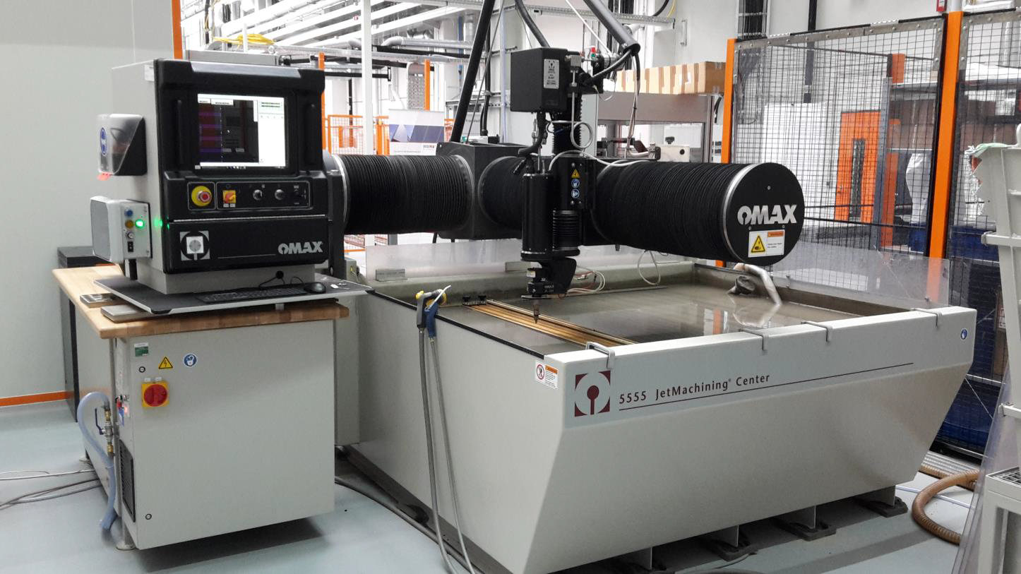 +In der OHLF werden hauptsächlich Faserverbundwerkstoffe verarbeitet. Beim Beschnitt dieser Werkstoffe ist der Einsatz der Wasserstrahlanlage unersetzlich. Hochleistungswerkstoffe wie CFK lassen sich mit der Wasserstrahlanlage ressourcen- und materialschonend bearbeiten. Die geringe Schnittbreite des Wasserstrahls verursacht lediglich einen geringen Materialverlust, zudem erfährt das Material durch die Bearbeitung keine thermische Belastung.